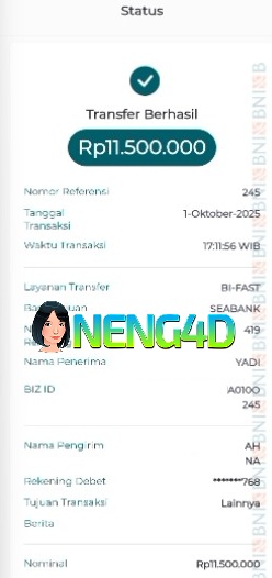 Bandar togel NENG4D merupakan bandar togel dan slot online yang membayar semua kemenangan member hingga lunas. Setiap pembayaran pada situs kami dilakukan dengan cara transfer ke rekening tujuan yang sudah didaftarkan pada situs togel online kami. Pembayaran hanya dapat diproses jika rekening yang didaftarkan telah valid dan dapat ditransfer. Semua kemenangan member yang mendapatkan hadiah jackpot terbesar akan kami posting agar semua pemain dapat melihat bahwa bandar situs terpercaya NENG4D ini membayar semua kemenangan member hingga lunas. Setiap postingan yang kami posting akan kami lakukan sensor pada nomor rekening 4 digit dan nama rekening untuk menjaga privasi dan kerahasiaan member. Postingan jackpot yang kami posting agar member atau pemain yang belum pernah bermain bisa melihat bandar togel bukan kaleng-kaleng seperti NENG4D ini. Semua postingan jackpot yang kami posting dapat dilihat keasliannya melalui nomor reff yang ditunjukkan pada bank atau m-banking saat kita melakukan transfer.